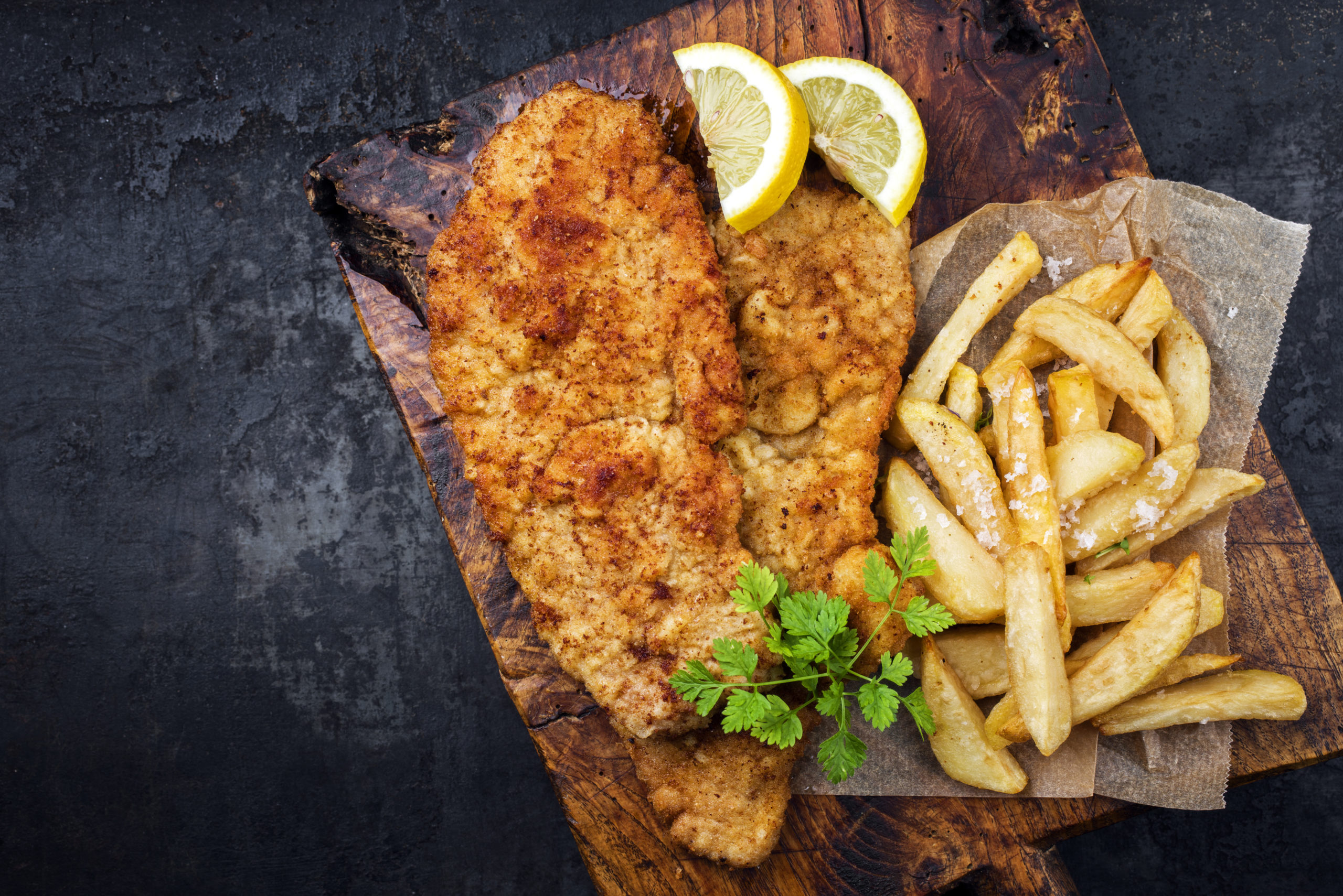 Fried Wiener schnitzel from veal topside with French fries and lemon slice as top view on an old rustic cutting board with copy space